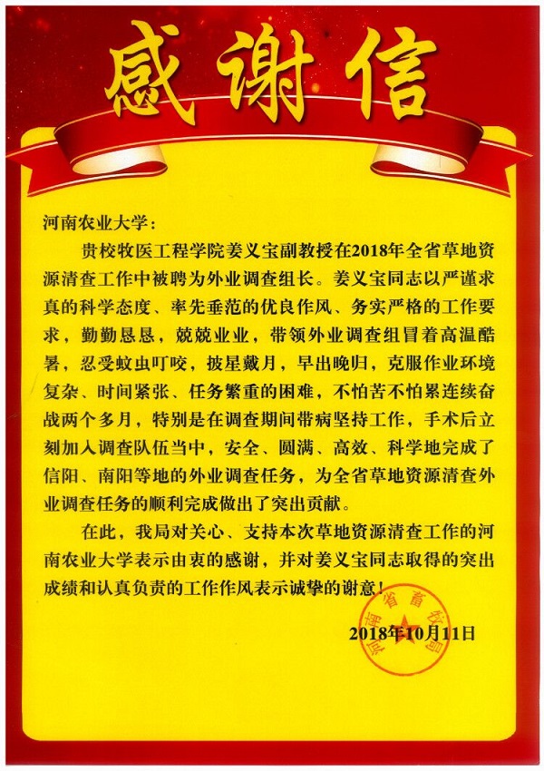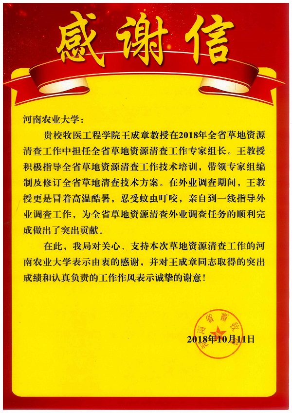 日前,九色视频 收到来自河南省畜牧局的感谢信,对九色视频 教师王成章、姜义宝在2018年全省草地资源清查工作中所做的出的贡献表示感谢,对他们严谨求真的科学态度、率先垂范的优良作风、务实严格的工作要求、吃苦耐劳的工作精神给予高度评价。他们的表现也展示了我们牧医人的风采。(文/韩笑)