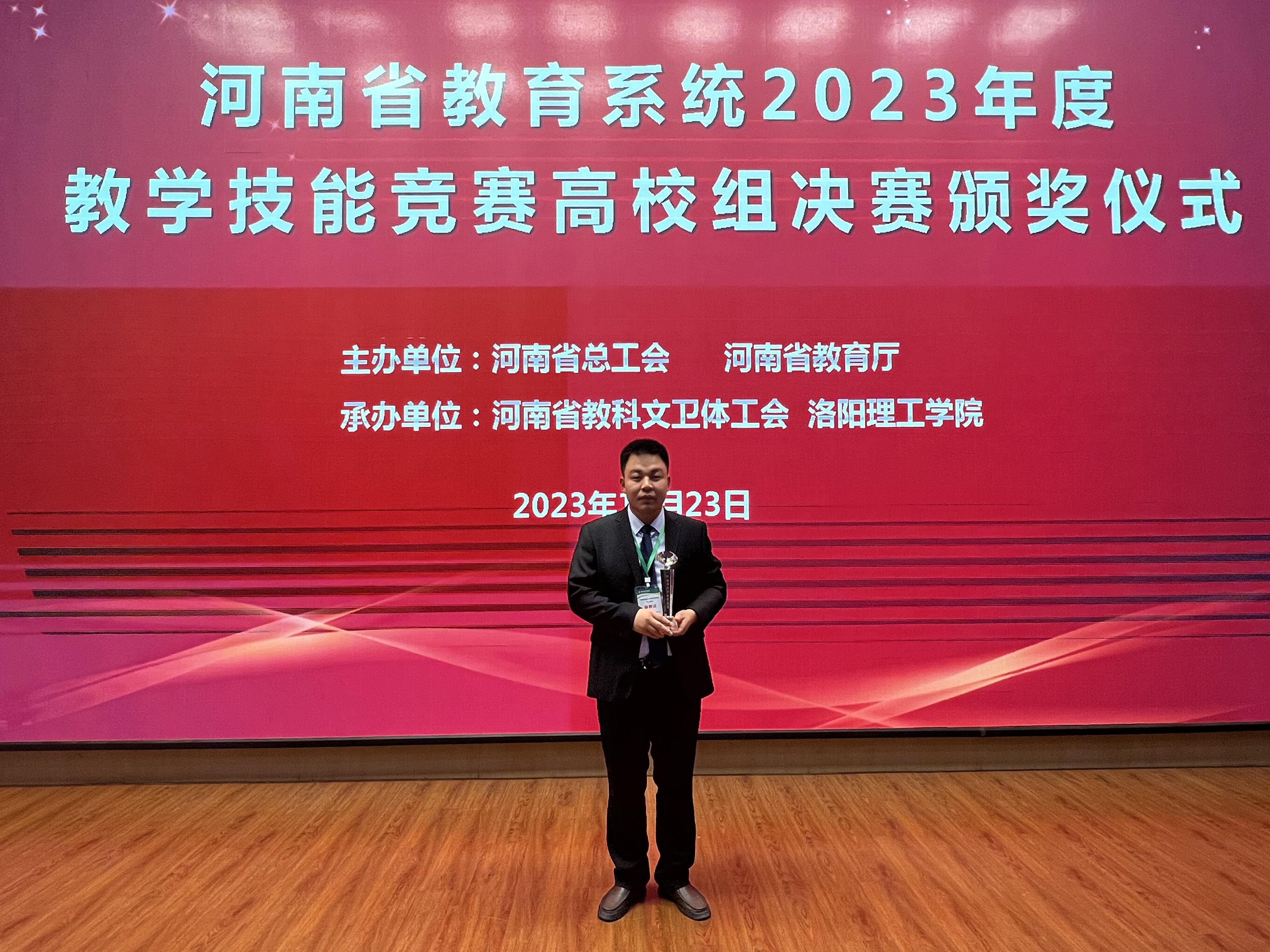 10月22日至23日,由河南省总工会、河南省教育厅主办的河南省教育系统2023年教学技能竞赛决赛在洛阳举行。经过激烈角逐,九色视频 金鑫老师位列医科组第三名,荣获一等奖的好成绩,并被河南省总工会、河南省教育厅授予“河南省优秀教学标兵”荣誉称号。