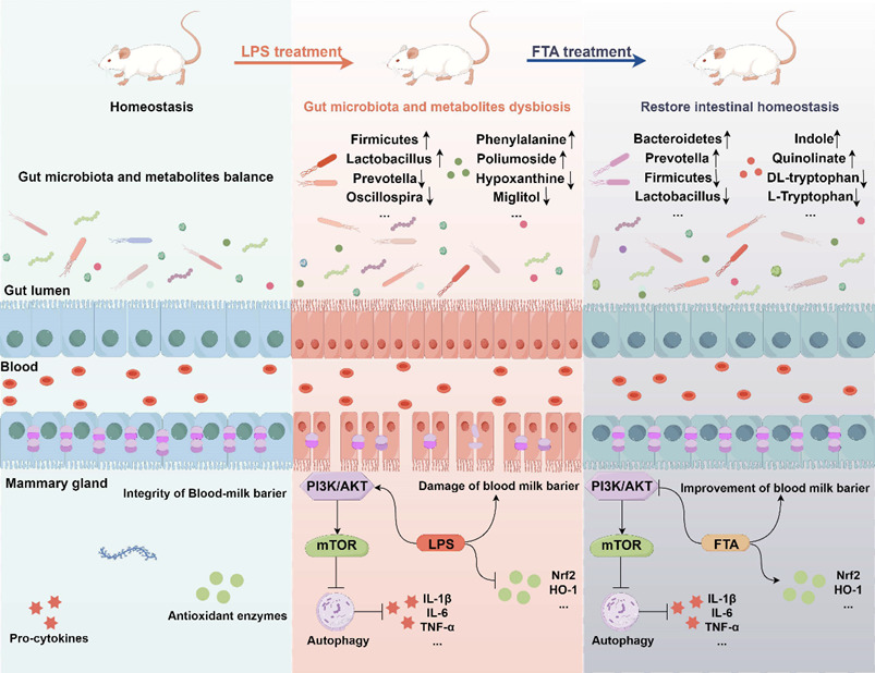本研究证实连翘酯苷A能够减轻LPS诱导的小鼠乳腺炎。此外,连翘酯苷A可以通过抑制PI3K/AKT/mTOR信号通路,激活自噬,降低炎症因子和凋亡基因的表达,从而修复炎症诱导的血乳屏障损伤。进一步的微生物组学和代谢组学显示,连翘酯苷A对乳腺炎的缓解作用与抑制有害细菌和有害代谢物、促进有益细菌和有益代谢物的能力高度相关。这些结果为FTA治疗奶牛乳腺炎的临床应用提供了新的依据。