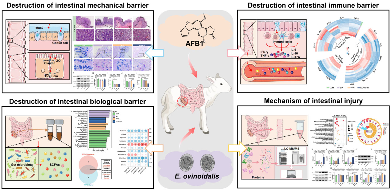 球虫病是由艾美耳属的多种球虫寄生于畜禽肠道所引起引起的在世界范围内广泛流行危害严重的疾病。以往研究证实,家禽食用被霉菌毒素污染的饲料会提高宿主对球虫的易感性,但这尚未在反刍动物中得到充分的研究。此外,肠道作为抵御有害物质进入机体内环境的第一道屏障,不仅是AFB1的主要暴露部位还是球虫发育和繁殖的场所。因此,本研究首次以绵羊为动物模型来深入探研究AFB1是否干扰宿主对球虫的易感性,以及AFB1和球虫联合作用时,是否影响球虫对肠道结构以及功能的破坏程度,同时基于蛋白组学揭示两种因素共存在下导致肠道损伤的分子机制(图1)。