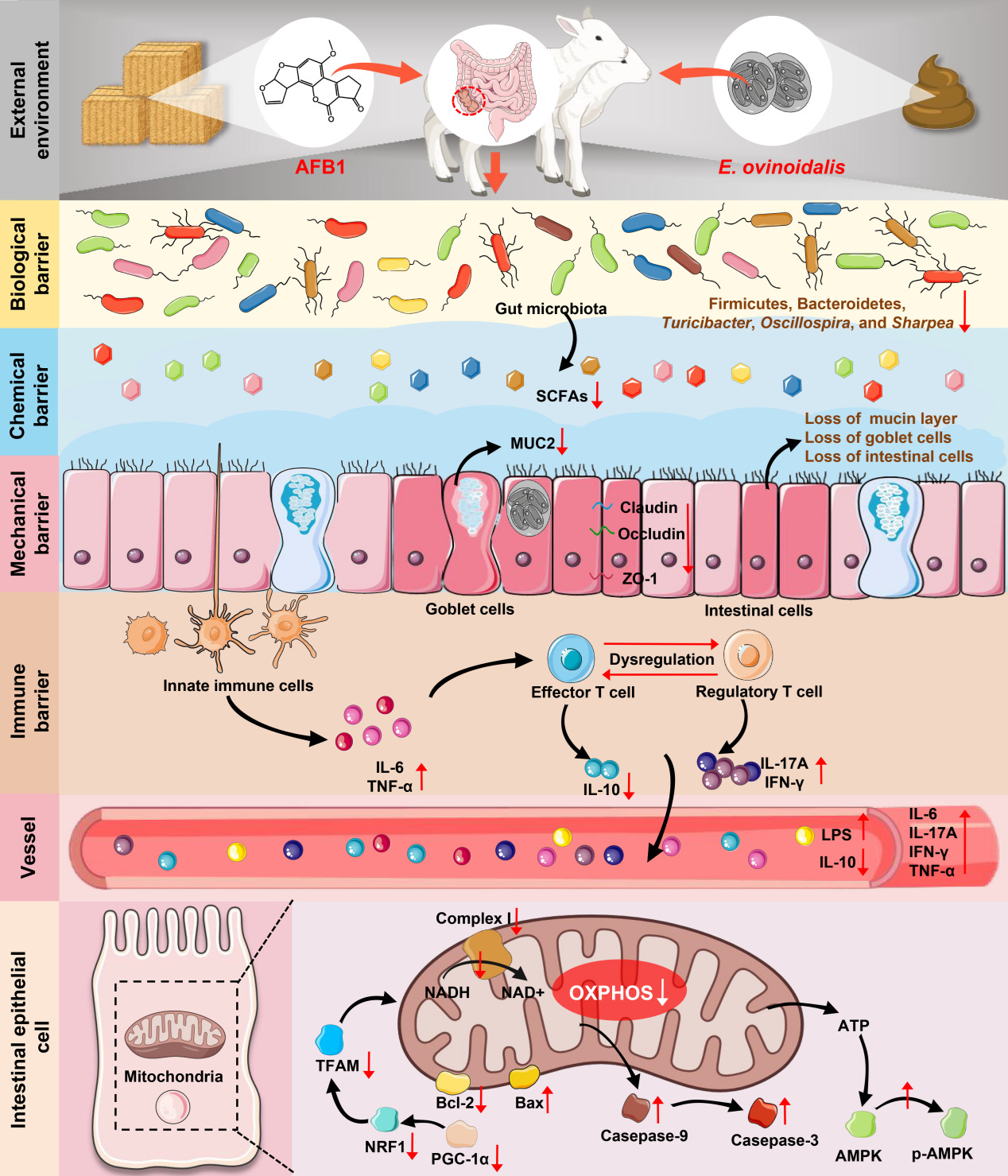 本论文首先以每天羔羊粪便中卵囊数目的变化揭示了暴露于AFB1可以干扰球虫病羔羊肠道内球虫卵囊的增殖与发育。此外,通过分析肠道组织病理学特征、肠道屏障功能、肠道菌群稳态、肠道炎症以及全身免疫的变化,揭示了AFB1通过胁迫肠道的机械屏障、免疫屏障和生物屏障以助推球虫对羔羊肠道的损害作用(图2)。基于蛋白质组学分析发现AFB1对盲肠氧化磷酸化通路的抑制作用和对细胞凋亡的促进作用可能是引起球虫感染羔羊卵囊排出高峰期提前以及卵囊排出量的降低的关键因素(图3)。这些结果揭示了AFB1暴露干扰球虫在肠道内增殖以及调控球虫对肠道损伤的关键分子机制,研究为AFB1参与类绵羊艾美耳球虫引起的羔羊肠道损伤提供新的见解以及靶向肠线粒体氧化磷酸化途径可能是干预霉菌毒素和球虫有害作用的潜在治疗策略(图4)。