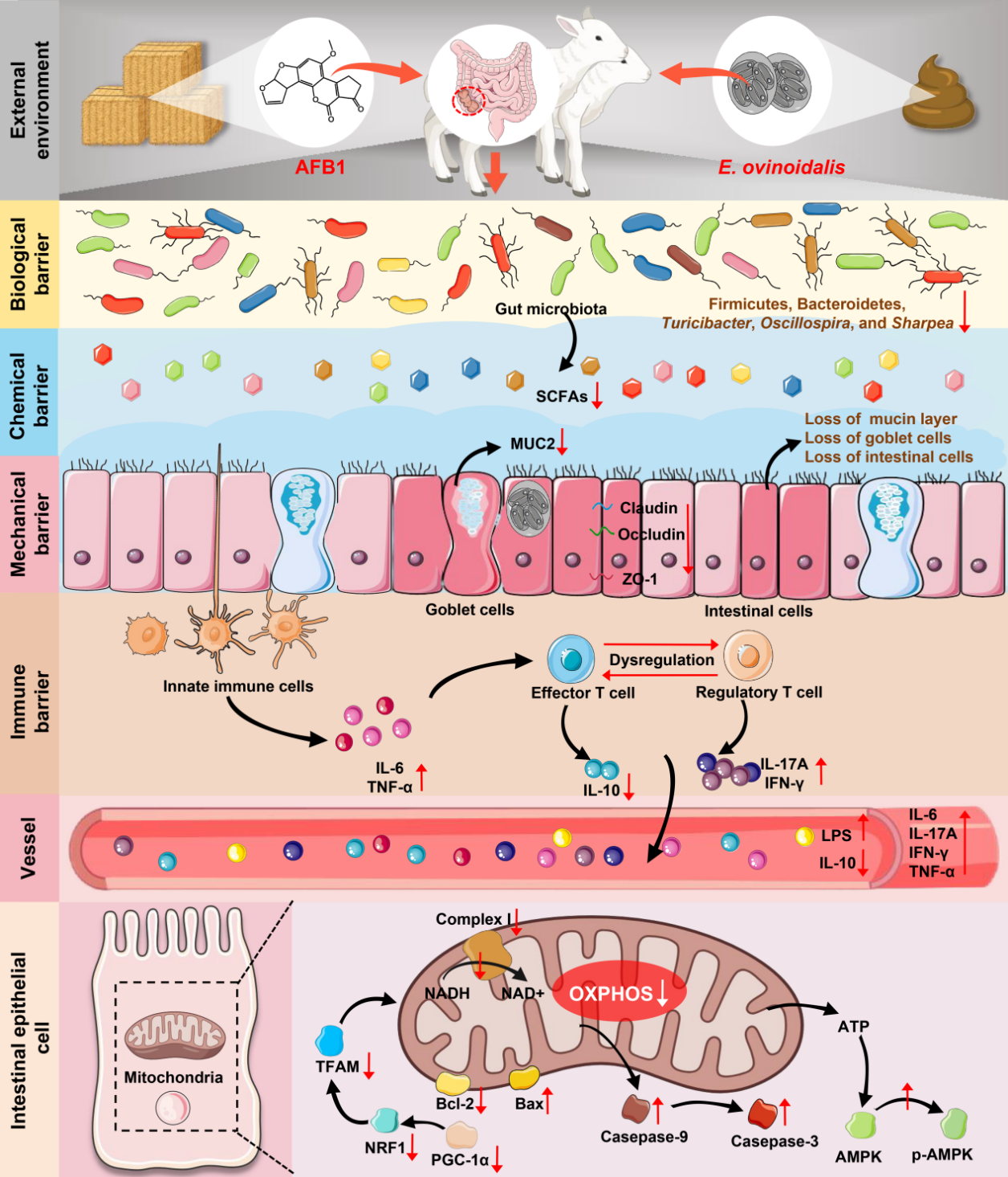 球虫病是由艾美耳属的多种球虫寄生于畜禽肠道所引起的在世界范围内广泛流行、危害严重的疾病,其中类绵羊艾美尔球虫(Eimeria ovinoidalis)是致病性较强的一种,前期团队已经建立感染模型并对其致病性进行了研究(Cheng et al., Veterinary Parasitology, 2024, 330:110250),发现类绵羊艾美耳球虫感染能够导致羔羊出现严重临床症状,诱导急性炎症,破坏肠道内环境稳态,导致代谢物和代谢通路产生差异,从而影响羔羊正常生长发育,降低产品质量,甚至造成羔羊死亡。以往研究证实,家禽食用被霉菌毒素污染的饲料会提高宿主对球虫的易感性,但这尚未在反刍动物中得到充分的研究。此外,肠道作为抵御有害物质进入机体内环境的第一道屏障,不仅是AFB1的主要暴露部位还是球虫发育和繁殖的场所。我们前期以绵羊为动物模型研究发现暴露于AFB1可以干扰类绵羊艾美耳球虫在肠道内的增殖状态,并调控球虫感染羔羊盲肠肠道形态、肠道屏障功能、肠道菌群稳态、肠道炎症以及全身免疫的变化,揭示AFB1通过胁迫肠道的机械屏障、免疫屏障和生物屏障帮助球虫对羔羊肠道的损害作用。进一步利用蛋白质组学分析揭示了AFB1与球虫共同存在下导致羔羊肠道损伤的潜在作用机制(该成果发表在环境科学与生态学领域国际著名期刊《Science of The Total Environment》,Chen et al., 2024, 947:174539;图1)。