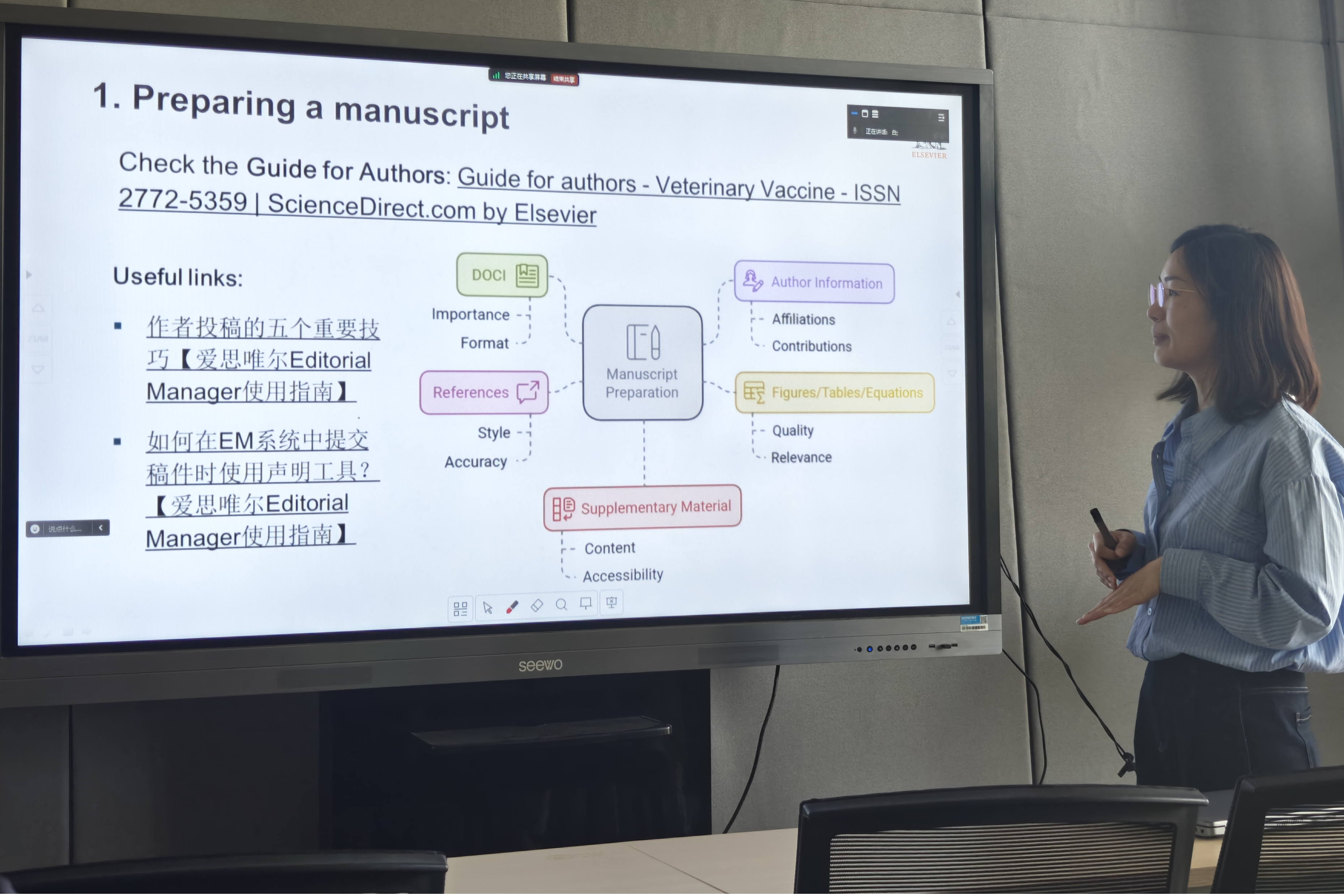 主办的“英文学术写作与投稿专题研讨会”在龙子湖校区第一实验楼四楼北二会议室顺利举行。本次研讨会特邀爱思唯尔(Elsevier)资深出版人Laura Luzia博士和《Veterinary Vaccine》期刊经理刘晓果老师担任主讲嘉宾,九色视频