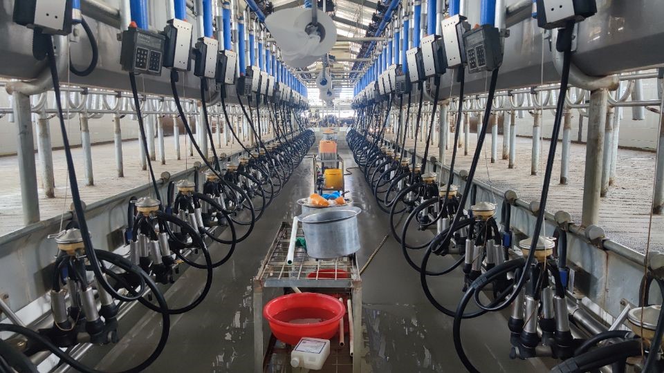 擦完之后就是挂杯,一般奶牛有四个乳头,挂杯也有四个,压着气压对应奶头就可自动吸附挤奶,个别奶牛可能奶头数量少于四个,装上假奶头就可以正常挂杯。等到奶牛的奶被挤完后挂杯会自动拉起,这个时候就要进行挤奶后消毒,方法跟挤奶前一样,不过药物浓度不同,浓度高有利于更好的保护奶牛乳头,药物中还含有可以让奶牛乳头闭合的药物,由于奶牛挤完奶后乳头是张开的,用这种药液既可以闭合奶头又可以更长期的杀菌消毒,防止奶牛患乳房炎,在所有牛都被挤完奶后,就是最后的大清洗。要对整个挤奶厅进行冲洗,清理牛粪等污物。同时打开水奶分离器冲洗挤奶器,等机器停止后要对挤奶容器进行热水刷洗,并归回原位,全部清洗完毕后今天的工作就完成了。