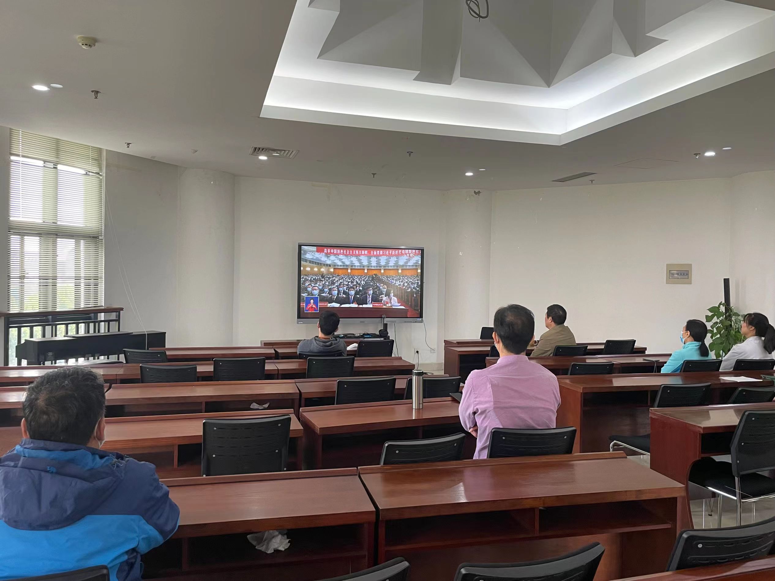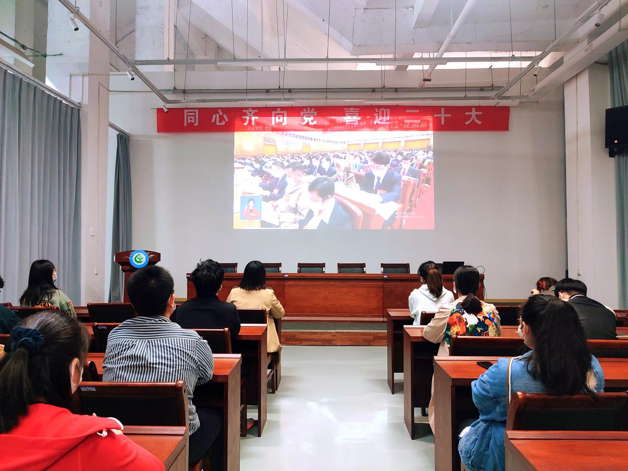 师生根据疫情防控形势采取集中或分散的形式收听收看二十大开幕会,认真学习习近平同志讲话精神。