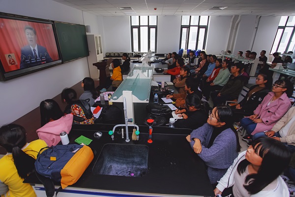 10月18日上午9点,当雄壮的国歌奏响时,龙子湖校区实验楼210、214实验室里一片庄严,这一刻,在场所有人的心情与北京人民大会堂就座的各位代表同样激动。在这里,学院各年级学生代表正在集中观看中国共产党第十九次全国代表大会开幕式盛况。学院班子成员及教工代表在430会议室集中收看十九大开幕式。