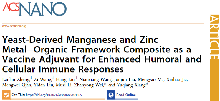 魏战勇教授课题组在国际著名期刊《ACS Nano》(中科院一区,IF=15.8)发表题为“Yeast-Derived Manganese and Zinc Metal–Organic Framework Composite as a Vaccine Adjuvant for Enhanced Humoral and Cellular Immune Responses”的研究论文。通过在酵母菌体表面层层自组装锰(Mn)和锌(Zn)的金属有机框架(MOF),构建出多功能复合佐剂yMZ(yeast@Mn-MOF-74@ZIF-8)。研究表明,yMZ佐剂与亚单位抗原(如:卵清蛋白)或灭活病毒(如:猪传染性胃肠炎病毒)结合后,可在体外、体内诱导强效、持久的体液和细胞免疫应答,为疫苗研发提供了高效、安全、绿色的新途径。