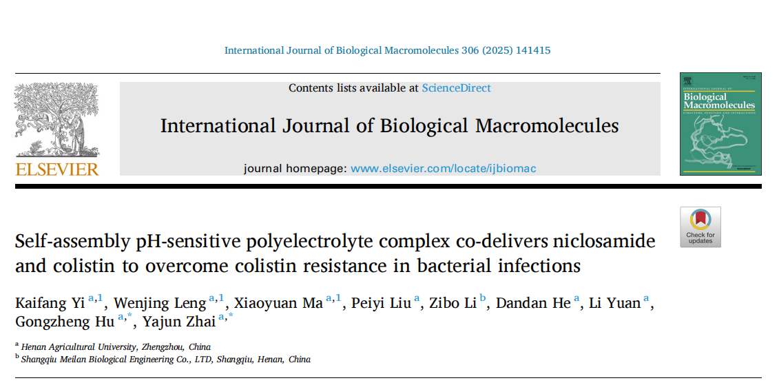近日,胡功政教授团队在《International Journal of Biological Macromolecules》(TOP期刊、中科院一区)上发表了题为“Self-assembly pH-sensitive polyelectrolyte complex co-delivers niclosamide and colistin to overcome colistin resistance in bacterial infections”的研究论文。该研究构建了共载黏菌素/氯硝柳胺的pH敏感性聚电解质复合物纳米递药系统(CS/AL-PECs@COL/NIC),力图逆转耐药的同时提高生物利用度增强疗效,降低毒副作用,为解决黏菌素及其佐剂的共递送和口服生物利用度低等问题提供新的策略和参考。