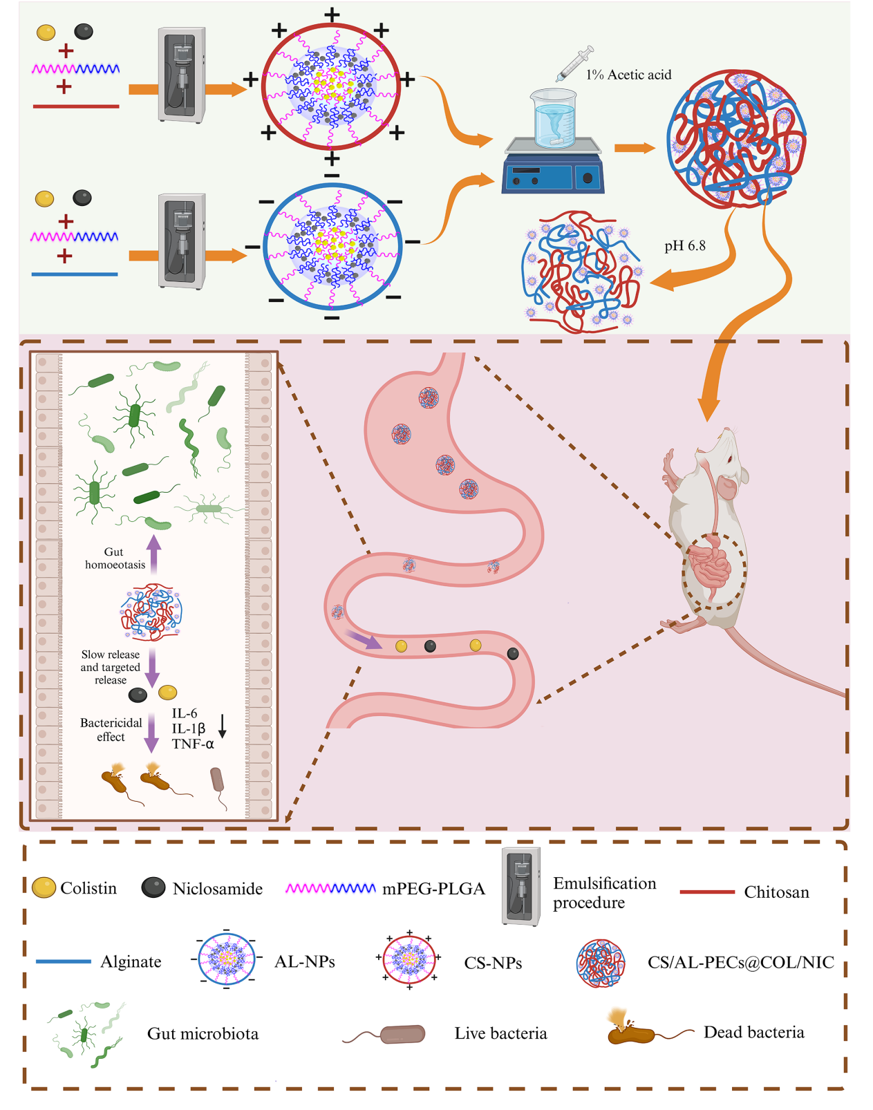 在本研究中,研究人员开发了一种用于黏菌素和氯硝柳胺口服给药的pH敏感性聚电解质复合物纳米递药系统,该纳米递药系统是由两种带相反电荷的纳米粒子(壳聚糖包覆的纳米粒和海藻酸盐包覆的纳米粒)通过静电相互作用自组装而成。分析结果表明,CS/AL-PECs@COL/NIC具有良好的血清稳定性和pH响应性,这有利于避免被胃酸降解,并在肠道感染部位实现靶向缓释。时间-杀菌曲线和活/死细菌染色检测证实,CS/AL-PECs@COL/NIC对黏菌素耐药革兰阴性菌的抗菌活性比游离黏菌素和氯硝柳胺的组合更强。此外,CS/AL-PECs@COL/NIC对大肠杆菌感染具有良好的体内抗菌活性,治疗效果显著,并且适口性良好。体内外生物安全性研究表明,CS/AL-PECs@COL/NIC应用前景广阔。更重要的是,与黏菌素不同,CS/AL-PECs@COL/NIC不会影响肠道微生物群的稳态。综上所述,这种共载黏菌素和氯硝柳胺的pH敏感性聚电解质复合物递送系统在克服黏菌素耐药性方面具有巨大潜力,可用于治疗耐黏菌素的细菌感染。