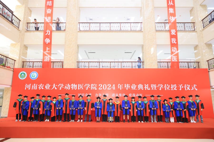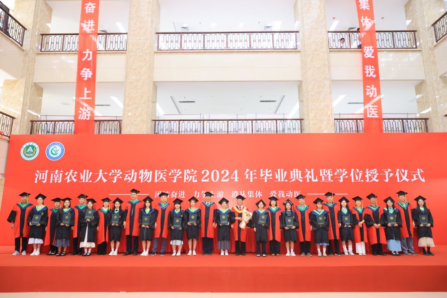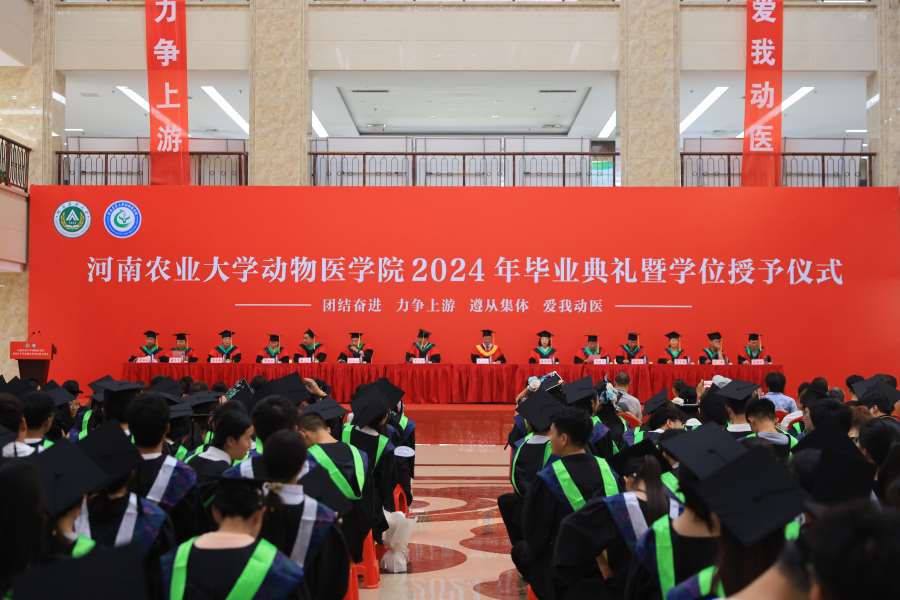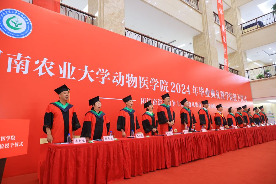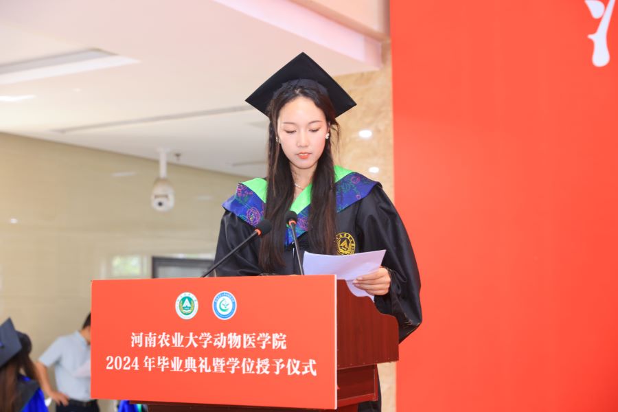 张龙现致辞,祝贺学院全体毕业生顺利毕业,并对毕业生提出了三点期望:一是要练就过硬本领,脚踏实地奋斗,要在学习中增长知识,在工作中增长才干,以真才实学服务人民,以创新创造贡献国家;二是心怀强国之梦,小我融入大我,要有情系中原、厚生丰民的责任情怀,牢记国家和社会的期望,在祖国和人民需要的时候站出来;三是常怀感恩之心,甘于奉献服务。并嘱托全体毕业生要时刻铭记身为动医人的责任,永葆动医人的底色,传承动医精神。