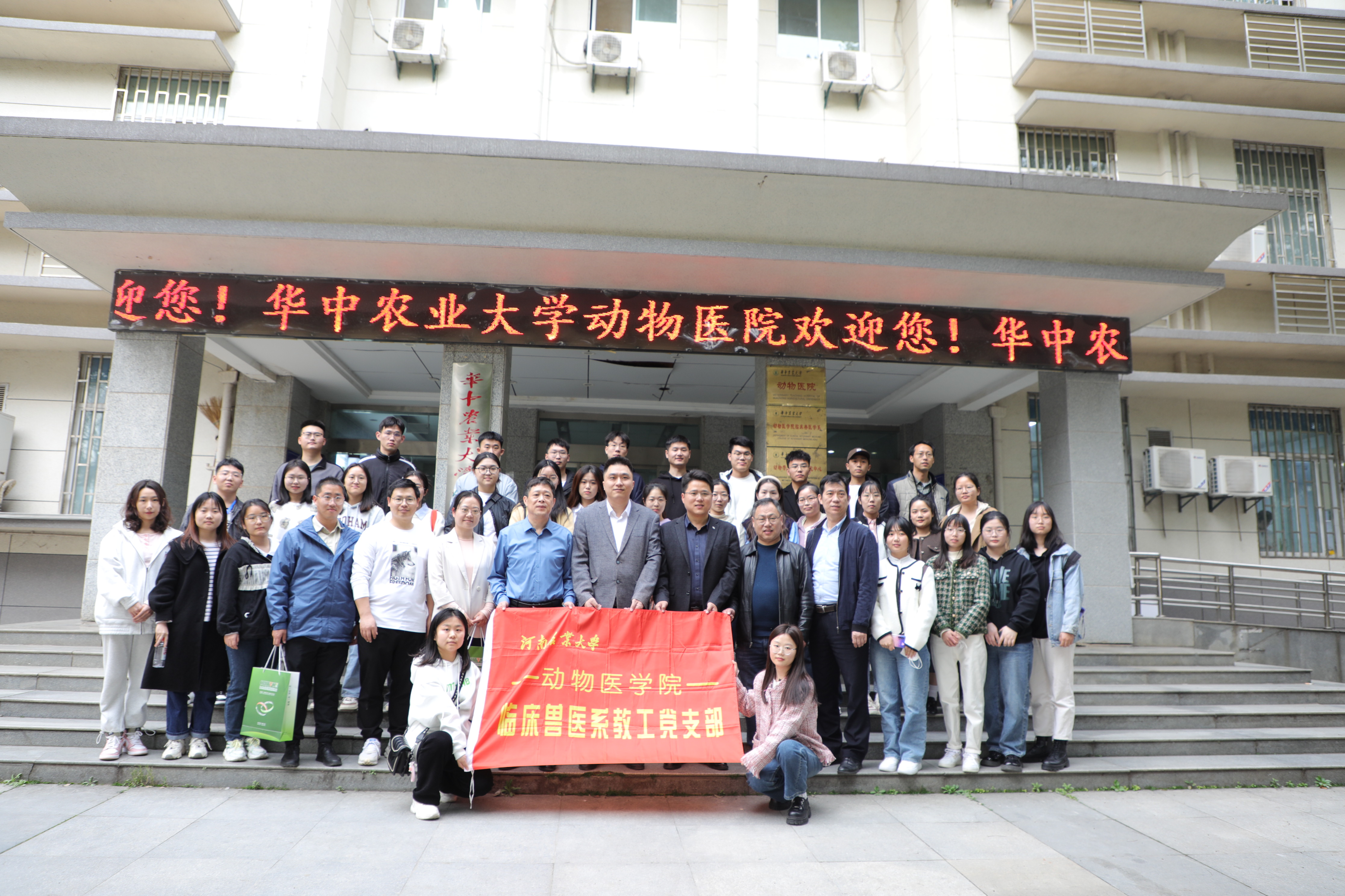 副院长韩立强教授、临床兽医系教工党支部书记王学兵教授、系副主任董海聚教授带领临床兽医系部分党员教师、21级临床兽医学科全体硕士研究生、19级动物医学本科创新班一行40余人赴华中农业大学动科动医学院、华中农业大学动物医院参观交流,华中农业大学动科动医学院党委副书记代金贵、华中农业大学动物医院刘东明老师等接待并陪同参观。双方就动物医院建设、支部党建和学生培养等情况进行了深入交流。