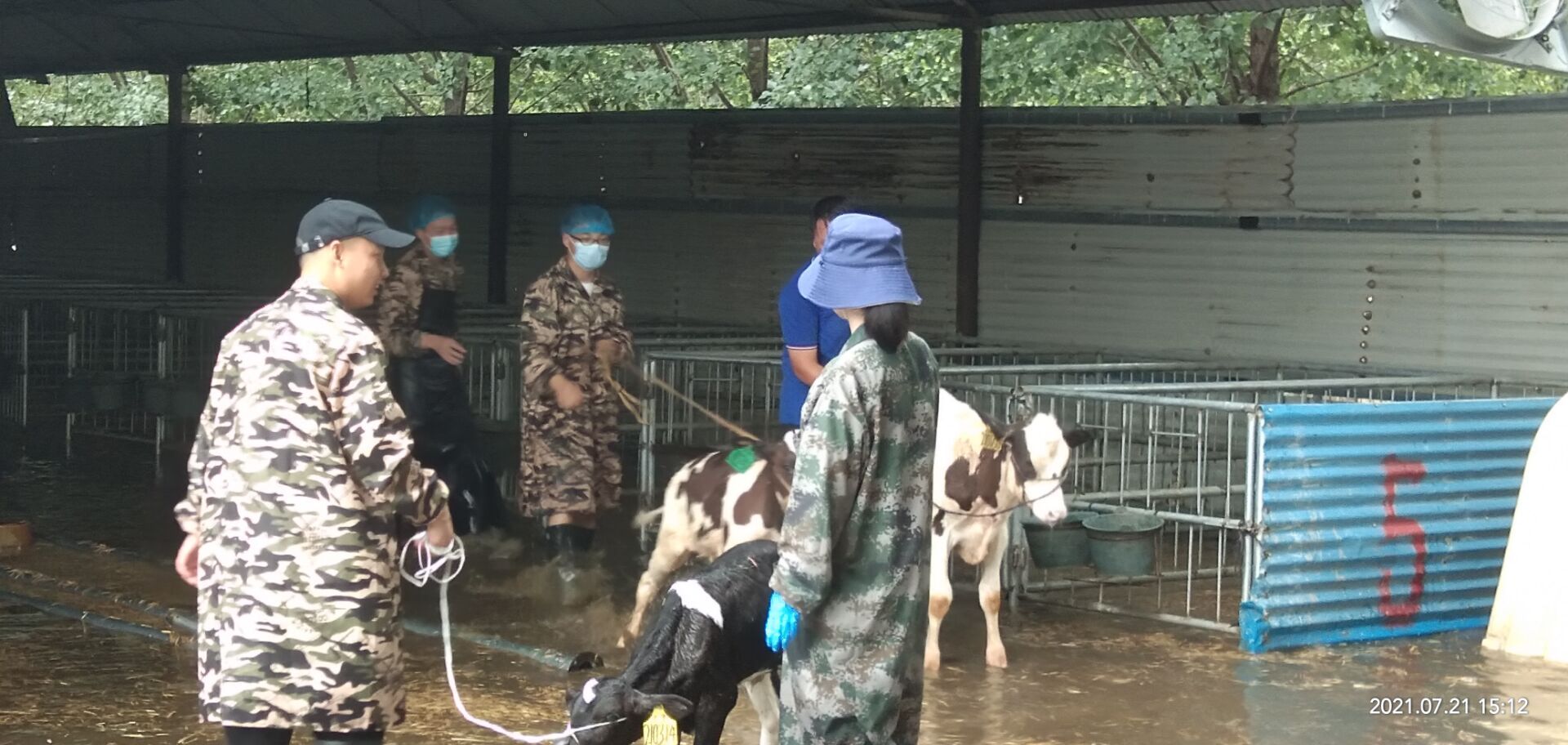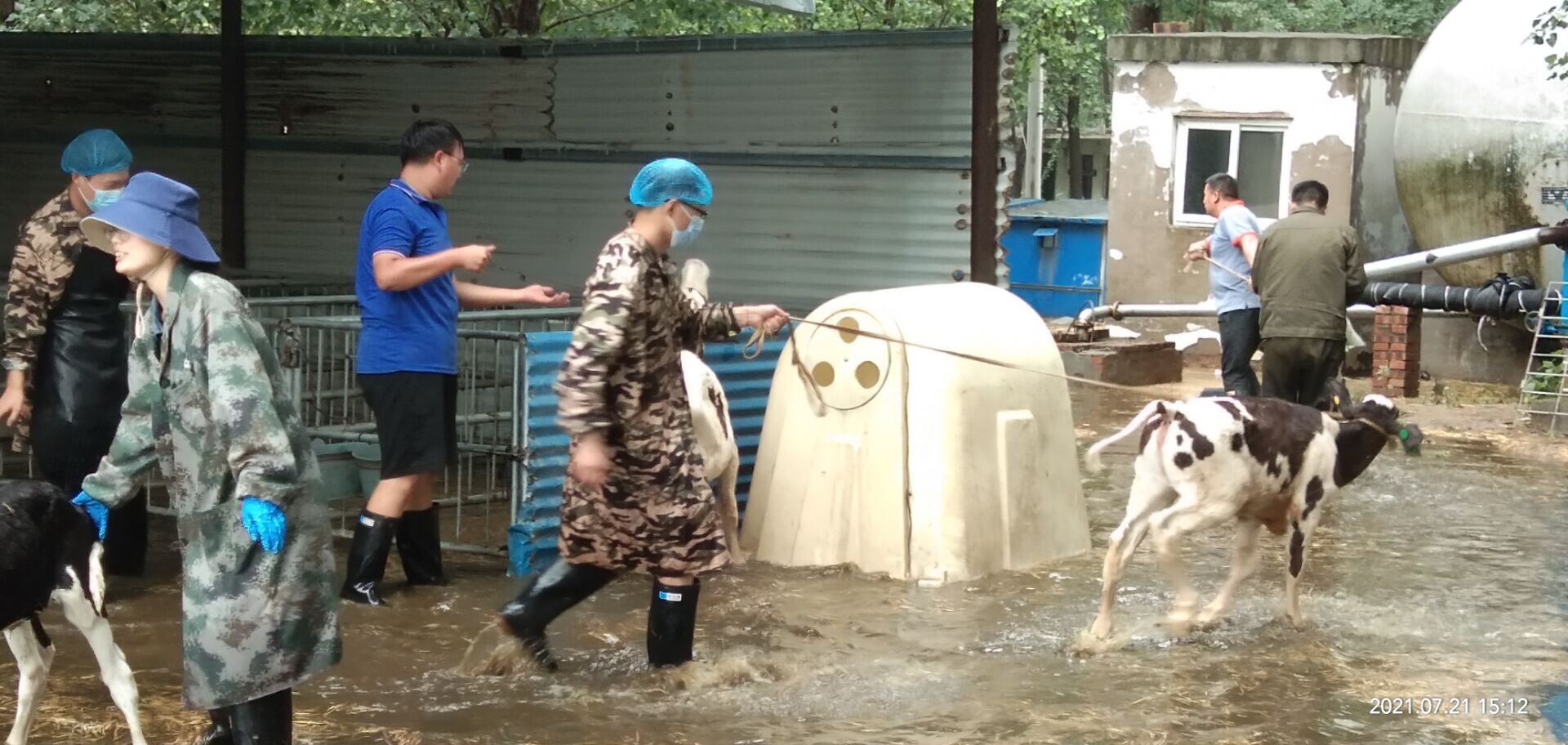 吴亚楠老师所在的河南省开封市通许牧原十四场区,于20日晚上笼罩在风雨雷电之中,仓库开始漏水、险情频发。作为实习带队老师,吴亚楠保证学生安全的同时,带领男生帮助企业搬运物资,减少了因洪灾引发的损失,还主动为场区驻守的抗洪人员运送食物。商艳红老师所在的原阳河南花花牛畜牧科技有限公司,犊牛圈被淹,需要紧急转移犊牛。商艳红带领实习学生参与到转移犊牛的行动中,共转移犊牛70余头,确保了场区犊牛的安全。宋亚鹏老师所在的河南省动物疫病预防控制中心也遭到了暴雨的考验。宋亚鹏带领男生们挥动着铁锹,用泥土袋在门口拉起了一道防洪屏障;女生们拧干拖把,用簸箕和水桶清理掉实验室的渗水,尽最大力量保护实验室内的仪器及样品。项玉强和王彦彬老师所在的豫北某饲料添加剂厂受损严重。两位老师第一时间协调救灾物资,以保证实习生们的饮用水和食物供应,并指导实习生分工协作地帮助场区清理淤泥、转移实验室样品,以减轻企业在洪灾中的损失。