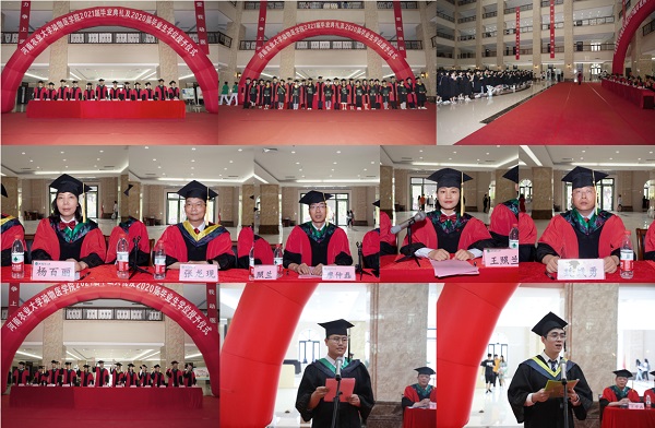 副院长魏战勇宣读2021届毕业生学士学位授予名单、院党委书记廖仲磊宣读2020届毕业生学位授予名单,院领导与学位委员会成员为毕业生一一拨正流苏,颁发学位证书并合影留念。