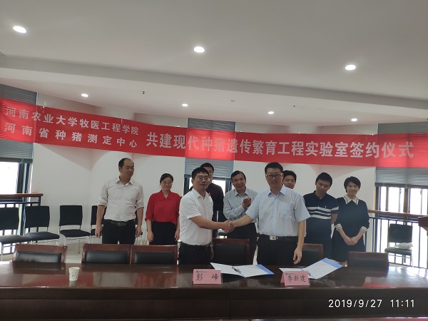 与河南省种猪性能测定中心共建现代种猪遗传繁育工程实验室签约仪式在第一实验楼北430举行。副院长李明、动物生产系统与工程系党支部书记李新建、动物遗传育种与繁殖系主任李春丽、学院办公室主任孙宇,河南省正阳种猪场副场长彭峰、副主任邵建伟等出席签约仪式。签约仪式由李新建主持。